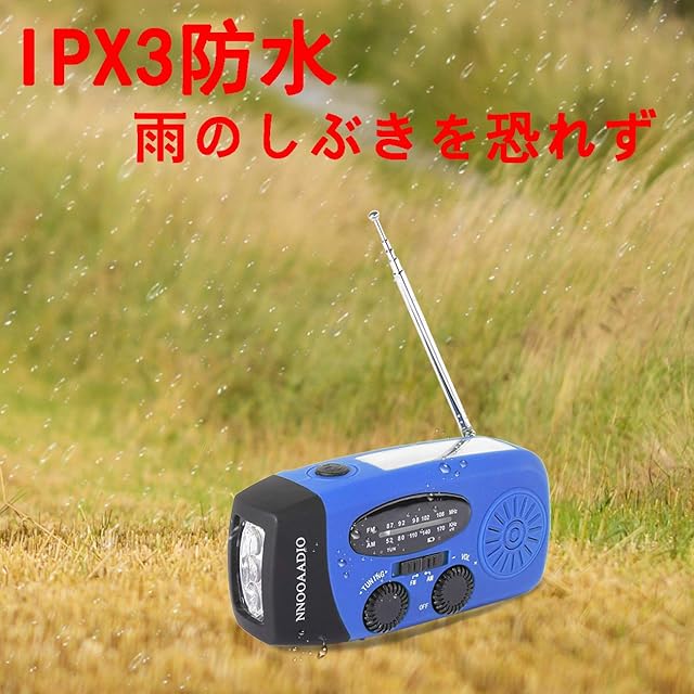 【照明とSOSと防水】このソーラーラジオは3つのLEDライトを共有しています。懐中電灯のスイッチを短く押すと、一段は弱い光、二段は強い光です。懐中電灯のスイッチを長押しします、SOS警報が鳴り,警報ハイビームがモス信号で点滅します。停電、戸外で家族と明るさをもたらすことができますと非常備蓄です。IPX 3-防水、この非常用照明器具は生活防水を満たしています。ラジオの飛散や小雨の被害から守ることができます。ただし、水に浸したり、雨に濡れたりしてはいけませんので、ご注意ください。