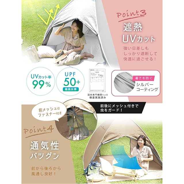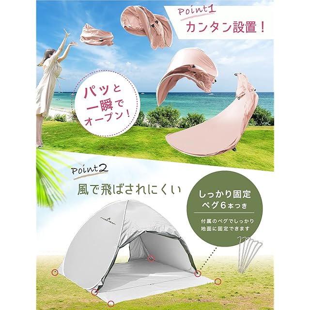 【組み立てがシンプル&スピーディー】 とことん使いやすさを追求し、テント組み立てに掛かる時間と煩わしい手順を大幅カット!専用ケースから取り出して手を放せば、5秒でぱっとテントが自動的に開きます。また、簡易シートも本体と一体になっているのでわざわざレジャーシートなどを敷く必要がありません。