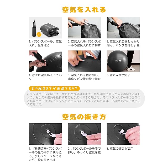 【高品質で耐久性のある素材】 PROIRONのバランスボールは、高品質な2mm厚のPVCで作られ、耐久性と快適性を兼ね備えています。6色のスタイリッシュなカラーから選ぶことができます。また、使用しやすいハンドポンプも同梱されています。空気充填方法や選択肢については、写真をご参照ください。
