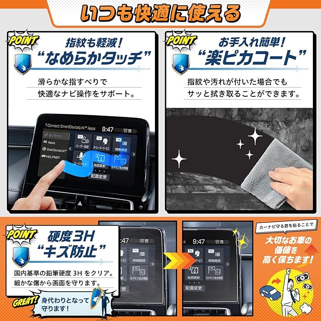 【スムースタッチ加工】:特殊コートにより、地図の操作でも指のひっかかりが少なく、ナビ操作を快適にします。 【傷つき防止】:国内基準の鉛筆硬度3Hをクリアしたフィルムで、引っかき傷などの細かな傷から画面を守ります。 【気泡防止】:弊社独自のシリコン吸着素材により、気泡は指やカードで簡単に押し出すことができます。貼り付けを失敗した場合でも貼り直しが可能です。