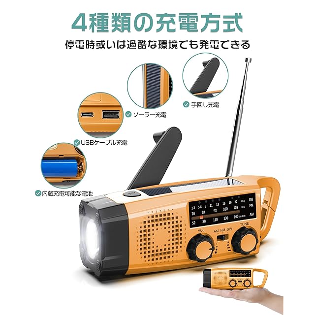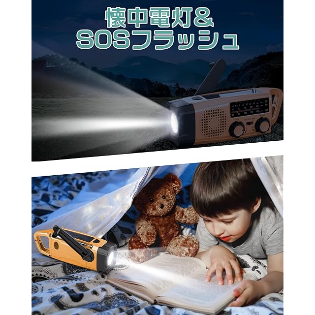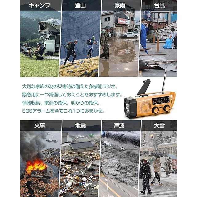 大切な家族の為の災害時の備えた多機能ラジオライト。 < br >緊急用に一つ常備しておくことをおすすめします。 < br >情報収集、電源の確保、明かりの確保、SOSアラームを全てこれ1つにおまかせ。 < br >◆SW/FM/AMラジオ < br >FM周波数76.00Mhz - 108MHz 、AM周波数522KHz - 1710KHz、SW周波数2.3 - 22MHz 。AM電波が入りにくい場所でもラジオを受信することができます。 < br >◆2000mAh大容量バッテリー搭載 < br >緊急時にiPhone・Androidなどの各種スマホを充電できます。 < br >フル充電時の点灯時間は約7時間、ラジオ時間は約13時間です。 < br >◆3つの充電方式 < br >手回し・USB・ソーラーの3つの充電方式を採用し、電源のない場所でも発電が可能。 < br >◆LEDライト < br >暗闇をしっかり照らせるLEDライトを付け。 < br >LEDライトにはフラッシュが付いています。緊急時にはライトのフラッシュ機能をオンにすると発見されやすくなります。 < br >◆SOSアラーム < br >SOSアラームを長押すと、SOSサイレンを「ON」にします。また短く押すと、SOSモードを切ります。 < br >◆安心アフターサポート < br >期間:お買い上げ日より12ヶ月間。 < br >取扱説明書に記載している注意事項をよくお読みになりご使用ください。 < br >商品の故障や不具合など、お客様の困りごとにも迅速に対応致します。お気軽にお問い合わせくださいませ。