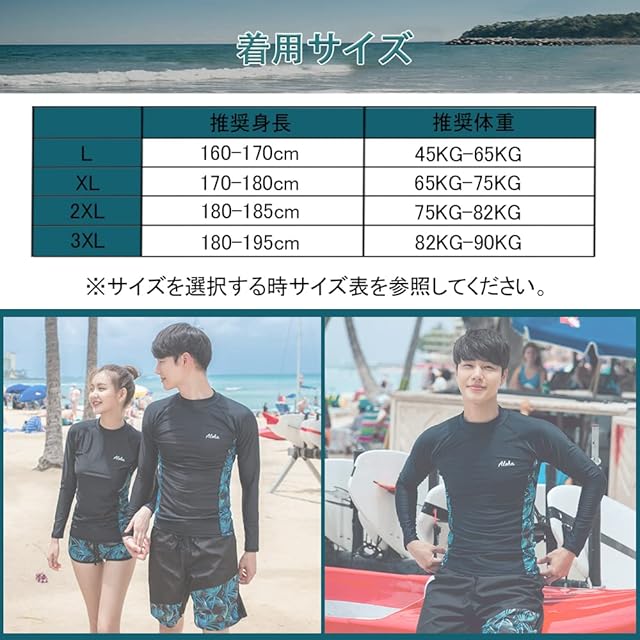 【セット内容&着用サイズ】長袖ラッシュガード、ハーフパンツ、レギンスの3点セット。必要なものがセットになっているので、届いてすぐに海に行くことができます。サーフパンツとレギンスセット、レギンス付き足首まであるので、虫刺されやクラゲ対策、擦り傷などの外傷対策にも。【着用サイズ】【L: 推奨身長160-170cm/推奨体重:45KG-65KG】【XL:推奨身長170-180cm/推奨体重:65KG-75KG】【2XL:推奨身長180-185cm/推奨体重:75KG-82KG】【3XL:推奨身長180-195cm/推奨体重:82KG-90KG】※サイズを選択する時サイズ表を参照してください。
