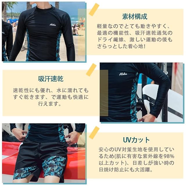 <b>【セット内容】</b><br/> 長袖ラッシュガード、ハーフパンツ、レギンスの3点セット。必要なものがセットになっているので、届いてすぐに海に行くことができます。サーフパンツとレギンスセット、レギンス付き足首まであるので、虫刺されやクラゲ対策、擦り傷などの外傷対策にも。<br/><br/> <b>【素材構成】</b><br/> 伸縮性と通気性に優れており丈夫で破れにくい素材を採用。軽量なのでとても動きやすく、最適の機能性、吸汗速乾通気のドライ繊維、激しい運動の後もさらっとした着心地!<br/><br/> <b>【吸汗速乾】</b><br/> 速乾性にも優れ、水に濡れてもすぐ乾きます、で運動も快適に行えます。前開き対応のラッシュガードは着脱も簡単です、着替えに便利。<br/><br/> <b>【UVカット】</b><br/> 安心のUV対策生地を使用しているため(肌に有害な紫外線を98%以上カット)、着るだけで、うっかり日焼け予防を実現。海やプール、アウトドアでの日焼け予防はもちろん、ランニング等の運動やタウンユースでも大活躍!<br/><br/> <b>【適用場合】</b><br/> スポーツやフィットネスに、サイクリング、スイミング、サーフィン、ダイビング、海水浴、プール、ビーチ、温泉と幅広いジャンルで使える便利なスポーツ・アイテムです。通勤、通学、ランニング、ヨガなど、スポーツウェアとしてもご利用いただけます。
