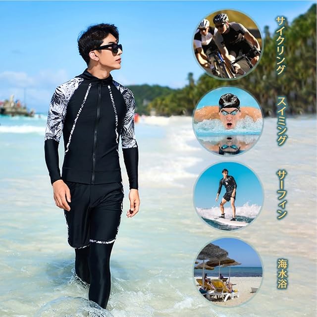<b>【セット内容】</b><br/> 長袖ラッシュガード、ハーフパンツ、レギンスの3点セット。必要なものがセットになっているので、届いてすぐに海に行くことができます。サーフパンツとレギンスセット、レギンス付き足首まであるので、虫刺されやクラゲ対策、擦り傷などの外傷対策にも。<br/><br/> <b>【素材構成】</b><br/> 伸縮性と通気性に優れており丈夫で破れにくい素材を採用。軽量なのでとても動きやすく、最適の機能性、吸汗速乾通気のドライ繊維、激しい運動の後もさらっとした着心地!<br/><br/> <b>【吸汗速乾】</b><br/> 速乾性にも優れ、水に濡れてもすぐ乾きます、で運動も快適に行えます。前開き対応のラッシュガードは着脱も簡単です、着替えに便利。<br/><br/> <b>【UVカット】</b><br/> 安心のUV対策生地を使用しているため(肌に有害な紫外線を98%以上カット)、着るだけで、うっかり日焼け予防を実現。海やプール、アウトドアでの日焼け予防はもちろん、ランニング等の運動やタウンユースでも大活躍!<br/><br/> <b>【適用場合】</b><br/> スポーツやフィットネスに、サイクリング、スイミング、サーフィン、ダイビング、海水浴、プール、ビーチ、温泉と幅広いジャンルで使える便利なスポーツ・アイテムです。通勤、通学、ランニング、ヨガなど、スポーツウェアとしてもご利用いただけます。