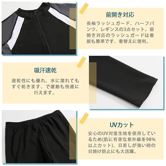 <b>【セット内容】</b><br/> 長袖ラッシュガード、ハーフパンツ、レギンスの3点セット。必要なものがセットになっているので、届いてすぐに海に行くことができます。サーフパンツとレギンスセット、レギンス付き足首まであるので、虫刺されやクラゲ対策、擦り傷などの外傷対策にも。<br/><br/> <b>【素材構成】</b><br/> 伸縮性と通気性に優れており丈夫で破れにくい素材を採用。軽量なのでとても動きやすく、最適の機能性、吸汗速乾通気のドライ繊維、激しい運動の後もさらっとした着心地!<br/><br/> <b>【吸汗速乾】</b><br/> 速乾性にも優れ、水に濡れてもすぐ乾きます、で運動も快適に行えます。前開き対応のラッシュガードは着脱も簡単です、着替えに便利。<br/><br/> <b>【UVカット】</b><br/> 安心のUV対策生地を使用しているため(肌に有害な紫外線を98%以上カット)、着るだけで、うっかり日焼け予防を実現。海やプール、アウトドアでの日焼け予防はもちろん、ランニング等の運動やタウンユースでも大活躍!<br/><br/> <b>【適用場合】</b><br/> スポーツやフィットネスに、サイクリング、スイミング、サーフィン、ダイビング、海水浴、プール、ビーチ、温泉と幅広いジャンルで使える便利なスポーツ・アイテムです。通勤、通学、ランニング、ヨガなど、スポーツウェアとしてもご利用いただけます。