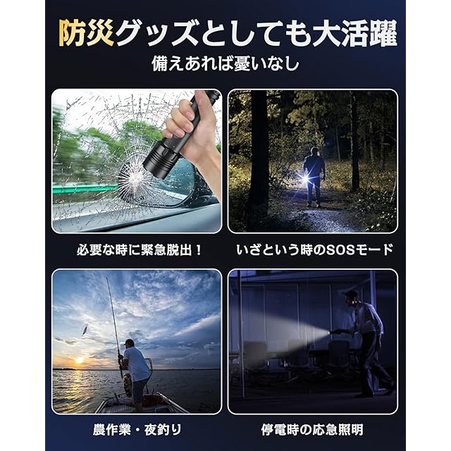 【高品質IPX-6防水+スマート急速放熱+フォーカス調整機能】シェルは高品質の航空宇宙グレードのアルミ合金素材で作られ、本体頑丈で2M耐衝撃性に優れ、防災や護身用などに使用可能です。シャープなギザギザ状のアルミニウム製の蓮の花の攻撃ヘッドを採用して、ガラスを簡単に粉砕でき、必要な時に脱出に使えます。サメのエラを模したスマート放熱設計を組み合わせて、迅速で効率的な放熱をしします。 IPX6防水等級と滑り止めハンドルデザインを采用しており、雨や雪の日でも正常に使用できます(水に浸さないでください)。懐中電灯のヘッド部分はを回して、ズーム機能が可能です。光束を広くから狭くして、最大500メートル遠くの物体に焦点を合わせます。拡大して180度広い物体領域を照らすこともできます。