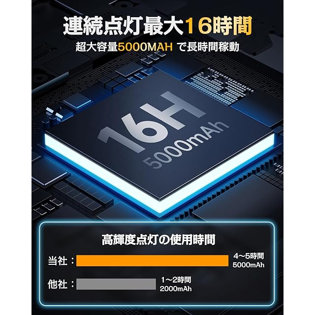 【バッテリー残量表示+USB充電式双方向+5000mAh大容量26650電池/連続点灯最大16時間】改良の4コマインジケーターランプは、従来のスイッチ式表示ランプよりも正確に具体的な電力量を表示したり、電池容量低下による充電必要時をお知らせしたりできます。内蔵のUSB入力ポートに付属のUSB充電ケーブルで懐中電灯へ充電でき、USB出力ポートに携帯電話やパソコンなどに電力がない緊急時には、モバイル電源として使えます。総寿命は約100,000時間で、循環充電が可能な大容量26650電池が付属して、フル充電の場合、最小モードで約16時間の連続使用ができ、最大モードでも約5時間の連続使用ができます。容量は普通の18650電池の2倍で、航続時間はもっと長いです。