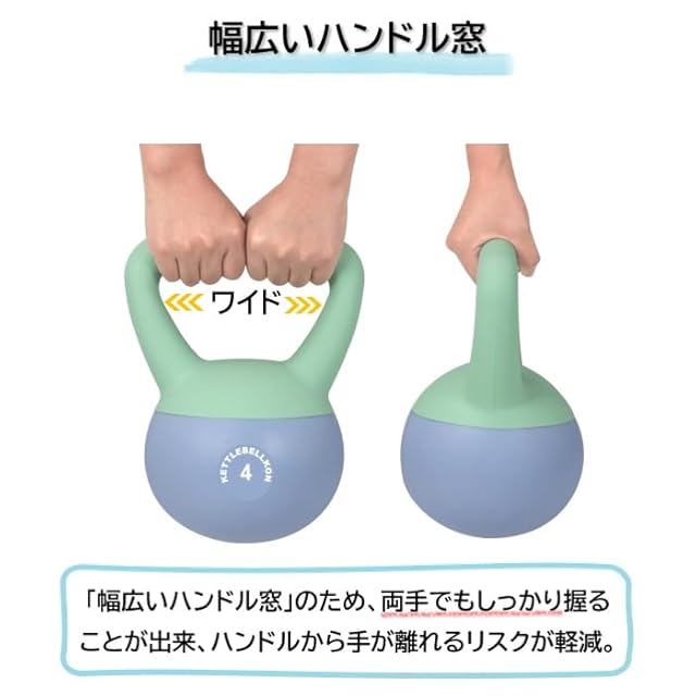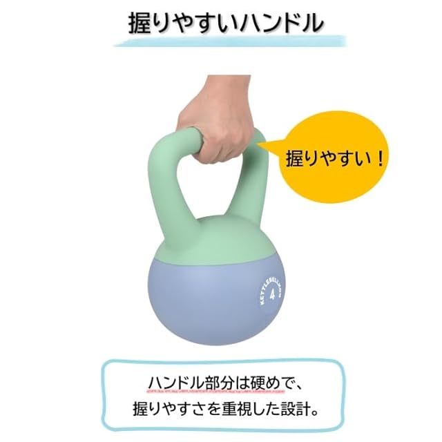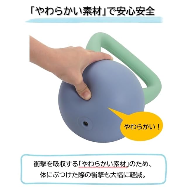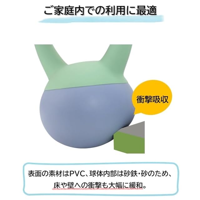 ・【やわらかい素材のケトルベル】ケトルベル魂ブランドの「やわらかい素材」のケトルベル。 衝撃を吸収する「やわらかい素材」のため、体にぶつけた際の衝撃も大幅に軽減されます。・【幅広いハンドル窓】ハンドル部分はワイドで硬めの素材のため、両手でもしっかり握ることが出来、ハンドルから手が離れるリスクも軽減されます。・【ご家庭での利用に最適】表面の素材はPVC、球体内部は砂鉄・砂のため、床や壁への衝撃も大幅に緩和。ご家庭内でも安心してトレーニング頂けます。・【重量バリエーション】★2kg 4kg 6kg 8kg 10kg 12kg 16kgを取り揃えています。★モニターの発色の具合によって実際のものと色が異なる場合がございます。製造ロットにより、商品本体の色あいが異なる場合がありますこと、予めご了承の程よろしくお願いいたします。・★ケトルベルの重量ごとに砂の量と空洞部分の割合が異なりますため、重量によっては砂の揺れ(砂の音)を大きく感じる事が有ります事、予めご了承の程お願いいたします。★日光により、色あせが生じることがありますのでご注意下さい。ゴムとの接触により、変色することがありますのでご注意下さい。
