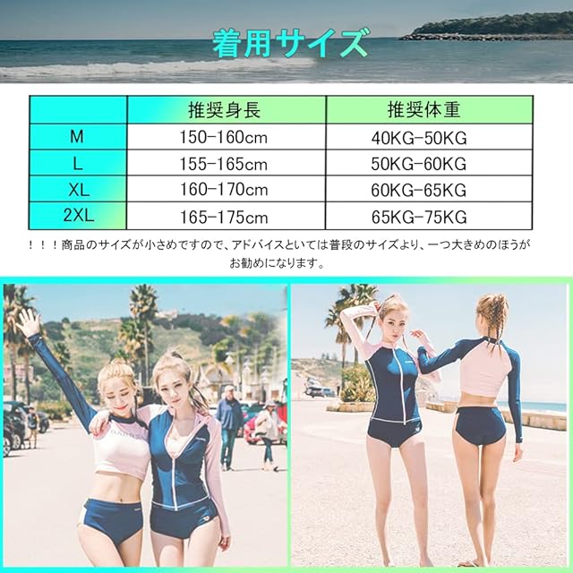 !!!商品のサイズが小さめですので、アドバイスといては普段のサイズより、一つ大きめのほうがお勧めになります。【セット内容&着用サイズ】長袖ラッシュガード、ショートパンツ、ブラ、レギンス、ビギニショーツがセットになっています。必要なものがセットになっているので、届いてすぐに海に行くことができます。長袖ラッシュガードとレギンスセット、レギンス付き足首まであるので、虫刺されやクラゲ対策、擦り傷などの外傷対策にも。【着用サイズ】【M: 推奨身長150-160cm/推奨体重:40KG-50KG】【L:推奨身長155-165cm/推奨体重:50KG-60KG】【XL:推奨身長160-170cm/推奨体重:60KG-65KG】【2XL:推奨身長165-175cm/推奨体重:65KG-75KG】※サイズを選択する時サイズ表を参照してください。