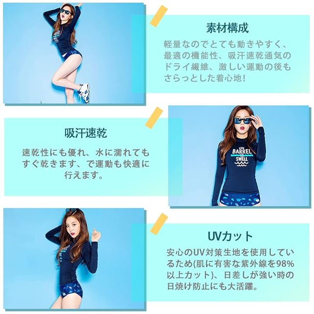 <b>【セット内容】</b><br/> 長袖ラッシュガード、ショートパンツ、ブラ、レギンス、ビギニショーツがセットになっています。長袖ラッシュガードとレギンスセット、レギンス付き足首まであるので、虫刺されやクラゲ対策、擦り傷などの外傷対策にも。<br/><br/> <b>【吸汗速乾】</b><br/> 速乾性に優れた水着素材なので、海やプールだけでなくジムやヨガなど 、汗をかくシーンでの使用もOK、水陸両用で全アイテム着たまま水に入れます。軽量なのでとても動きやすく、最適の機能性、吸汗速乾通気のドライ繊維、激しい運動の後もさらっとした着心地!<br/><br/> <b>【UVカット】</b><br/> 安心のUV対策生地を使用しているため(肌に有害な紫外線を98%以上カット)、日差しが強い時の日焼け防止にも大活躍。もちろん紫外線対策もばっちりでお肌を守ります、防菌防臭。<br/><br/> <b>【優れたデザイン】</b><br/> お洒落な柄プリントすっきりしたシンプルなデザイン、機能性だけでなくデザインも考え抜かれた商品です。襟元、手首、足首にスキンケアデザインを使って、運動の快適性をします。<br/><br/> <b>【適用場合】</b><br/> 夏場のウォータースポーツや野外活動の際、海、ジム、プールやビーチ、、温泉と幅広いジャンルで使える便利なスポーツ・アイテムです。通勤、通学、ランニング、ヨガなど、スポーツウェアとしてもご利用いただけます。