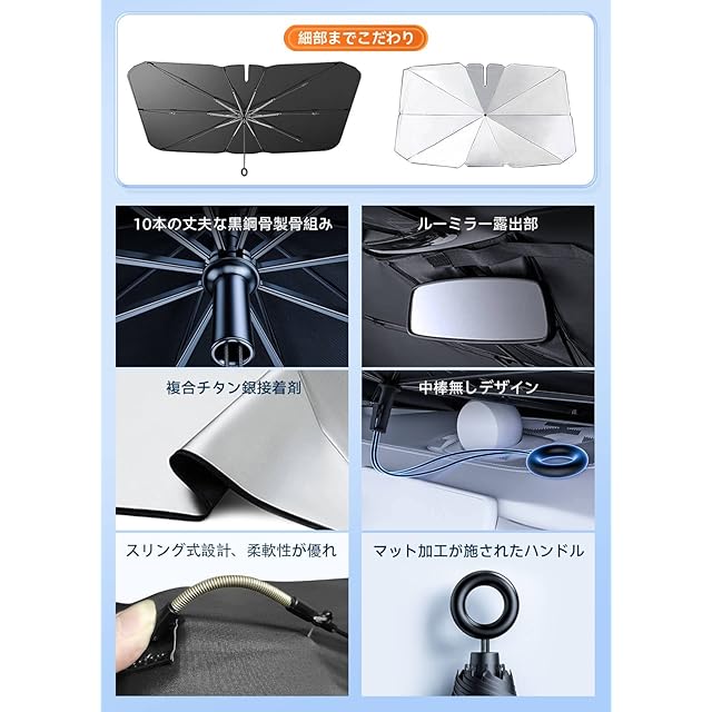 【中棒無し&ミラー部分露出デザイン】丈夫な10本傘骨は頑丈な黒鋼骨製を採用し、耐久性に優れて最強の安定性を実現します。中棒無しのデザインで、取り付け時、金属の傘柄が車のダッシュボードと内装を傷つける心配ありません。ガラスと接触する四隅にプラスチックの保護カバーで被る二重保護設計で、車のダッシュボードと内装に傷をつける心配なく、安心して設置できます。上部中央に切れ目があるので、バックミラーやドラレコには干渉なし、駐車際にドライブレコーダーは正常に撮影します。