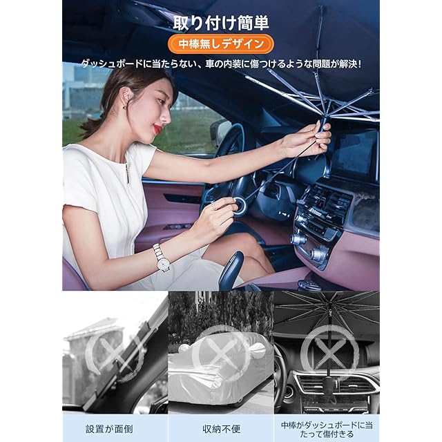 【内装劣化防止&車内温度上昇防止】傘式サンシェードはチタンシルバーコーティング塗装を施した生地で作られ、高屈折率、有害紫外線の照射ダメージを効果的に防ぐことができます。そして、駐車時大事な愛車を太陽光による損傷ダッシュボード、座席等の内装の日光による劣化をからしっかりと守ります!車内温度の上昇を防止し、長時間露天駐の後にあまりの高温でイライラすることなく気持ちよく運転を始め、エアコンへの負荷が減り、燃費を向上させます。