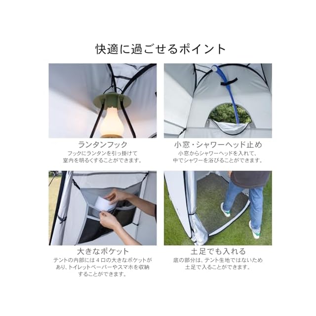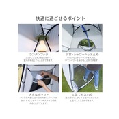 【快適に使える工夫が盛りだくさん】【ポケット】内側には、ハンガーなどを掛けることができるロープが備わっており、衣類や小物を吊るして整理することができます。小物を収納できるポケットがあるため、トイレットペーパーやスマホなどちょっとした物の収納ができます。【ランタンフック】天井にはランタンを掛けられるフックがあるので、ランタンを吊り下げれば暗い時でも内部を明るく照らすことができます。