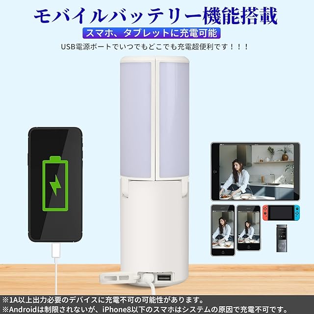 ☀【照明だけでなく、モバイルバッテリー機能搭載】市販の2500mAhのソーラーランタンは違い、弊社の最新型ソーラーランタンは8000mAh大容量バッテリー内蔵されており、輝度Maxで最短10時間、輝度Minで最長150時間連続点灯できます。またソーラーランタンは照明用だけでなく、更にモバイルバッテリー機能も搭載、緊急時にお手元のスマホなどデバイスにも充電をサポートします。キャンプで不可欠の1台2役のグッズです!