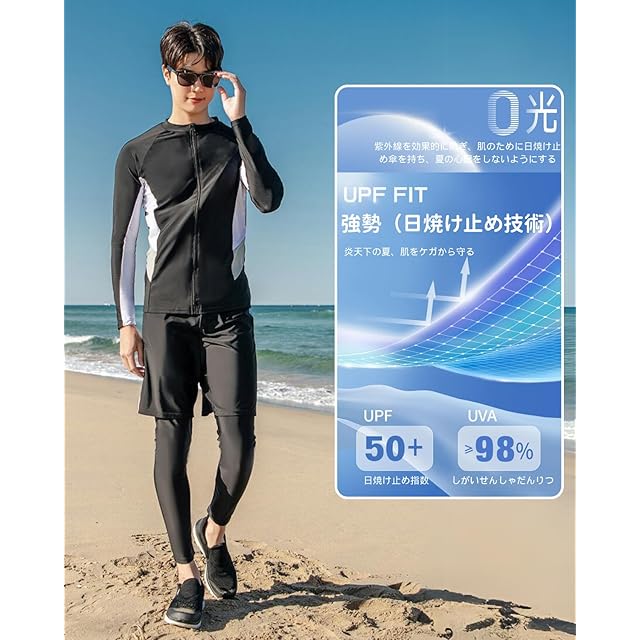 商品名:[xulee] ラッシュガード メンズ 水着 長袖 前開き サーフパンツ レギンス 3点セット ジップ アップ スイミング サーフパンツ レギンス ビーチ 水泳パンツ 温泉 通気性 [UVカット UPF50+・吸汗速乾] フィットネス 水陸両用 2312-2XL