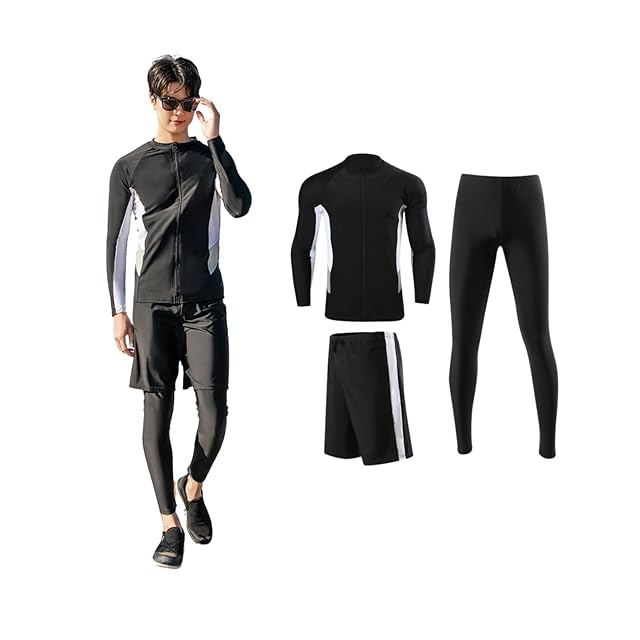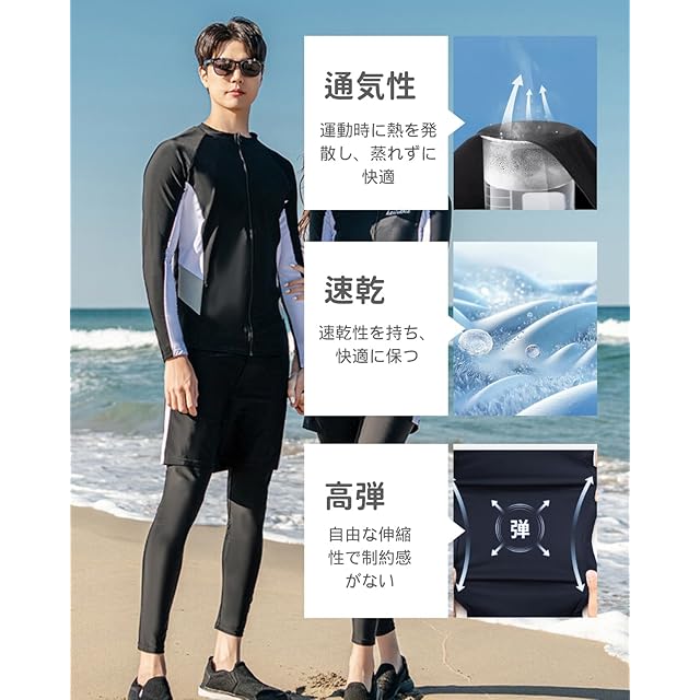 【メンズ3点セット】ラッシュガード+サーフパンツ+レギンス。ポリウレタン。ソフトな肌触りの冷感素材を使用、良い着心地と抜群の耐久性、ストレッチが効いているので動きやすいです。【UV対策】UVカット生地を使用しているので、着るだけで首元から足首までしっかり日差しからガード。岩場等でのケガから身を守る為にも着いているだけで安心感UP!サーフパンツとレギンスセット、レギンス付き足首まであるので、虫刺されやクラゲ対策、擦り傷などの外傷対策にも 【水陸両用フィットネスウェア】ポリエステルポリウレタン伸縮性と通気性に優れており丈夫で破れにくい素材を採用。軽量なのでとても動きやすく、最適の機能性、吸汗速乾通気のドライ繊維、激しい運動の後もさらっとした着心地!運動に最適です!ジスポーツやフィットネスに、スイミング、サーフィン、ジム、サイクリング、ダイビングと幅広いジャンルで使える便利なスポーツアイテムです。