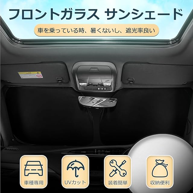 2.【4層構造】:1層目:高品質高密度アルミ遮熱シート、2層目:ポリウレタン断熱素材、3層目:高品質高密度アルミ遮熱シート、4層目:ポリウレタン断熱素材。高い断熱効果がある素材によって、夏の日で強い日差しを遮断して、車内の温度を減ります。また、紫外線を効果的にカット出来ます。冬の日で窓からの冷気の浸入を防ぎ、車内温度をキープして車中泊も快適です。エアコンの効率を良くするので省エネになります。従来品よりも遮光性や保温性を大幅にアップし、夏の日を温度下げて、冬の日を温度を上げる効果があります。エアコンの効率を良くするので省エネになります。ブラックメッシュ仕上げ。✔注意:他社の製品の外観は本社と同じく、でも相手は5層などを宣伝していますが、実際には本社と同じく2層構造です。✔本物の5層は厚くて使用不便、特に頻繁使用の場合、実用性はゼロになります。