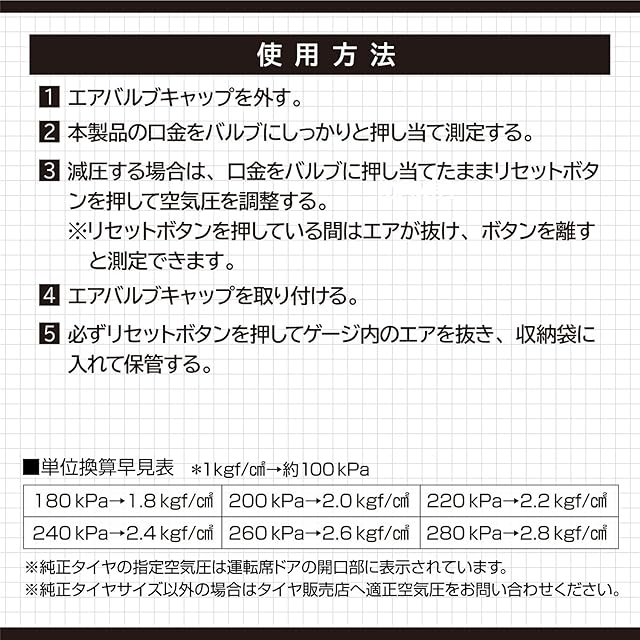 ゲージ径:Φ35・最大測定値:500kPa・精度:±10kPa・空気圧単位:1kgf/㎠=100kPa