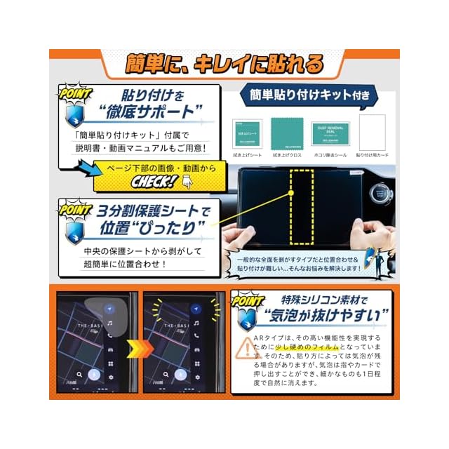 【スムースタッチ加工】:特殊コートにより、地図の操作でも指のひっかかりが少なく、ナビ操作を快適にします。 【傷つき防止】:国内基準の鉛筆硬度3Hをクリアしたフィルムで、引っかき傷などの細かな傷から画面を守ります。 【気泡防止】:弊社独自のシリコン吸着素材により、気泡は指やカードで簡単に押し出すことができます。貼り付けを失敗した場合でも貼り直しが可能です。