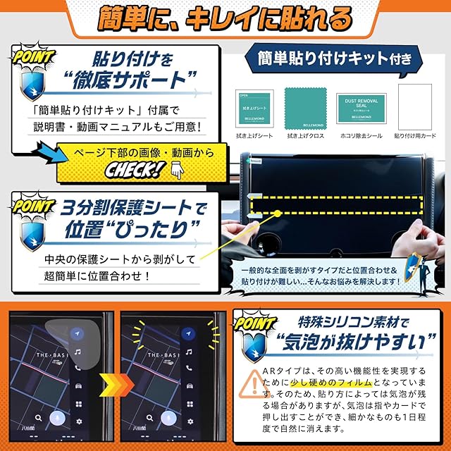 【スムースタッチ加工】:特殊コートにより、地図の操作でも指のひっかかりが少なく、ナビ操作を快適にします。 【傷つき防止】:国内基準の鉛筆硬度3Hをクリアしたフィルムで、引っかき傷などの細かな傷から画面を守ります。 【気泡防止】:弊社独自のシリコン吸着素材により、気泡は指やカードで簡単に押し出すことができます。貼り付けを失敗した場合でも貼り直しが可能です。