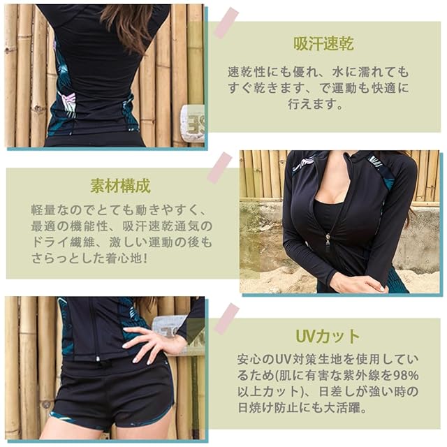 <b>【セット内容】</b><br/> 長袖ラッシュガード、ショートパンツ、ブラ、レギンス、ビギニショーツがセットになっています。長袖ラッシュガードとレギンスセット、レギンス付き足首まであるので、虫刺されやクラゲ対策、擦り傷などの外傷対策にも。<br/><br/> <b>【吸汗速乾】</b><br/> 速乾性に優れた水着素材なので、海やプールだけでなくジムやヨガなど 、汗をかくシーンでの使用もOK、水陸両用で全アイテム着たまま水に入れます。軽量なのでとても動きやすく、最適の機能性、吸汗速乾通気のドライ繊維、激しい運動の後もさらっとした着心地!<br/><br/> <b>【UVカット】</b><br/> 安心のUV対策生地を使用しているため(肌に有害な紫外線を98%以上カット)、日差しが強い時の日焼け防止にも大活躍。もちろん紫外線対策もばっちりでお肌を守ります、防菌防臭。<br/><br/> <b>【優れたデザイン】</b><br/> お洒落な柄プリントすっきりしたシンプルなデザイン、機能性だけでなくデザインも考え抜かれた商品です。襟元、手首、足首にスキンケアデザインを使って、運動の快適性をします。<br/><br/> <b>【適用場合】</b><br/> 夏場のウォータースポーツや野外活動の際、海、ジム、プールやビーチ、、温泉と幅広いジャンルで使える便利なスポーツ・アイテムです。通勤、通学、ランニング、ヨガなど、スポーツウェアとしてもご利用いただけます。