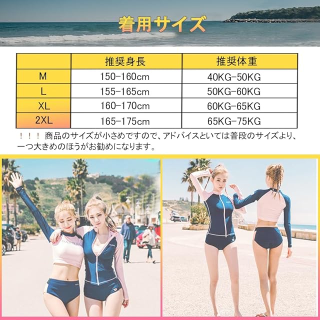 !!!商品のサイズが小さめですので、アドバイスといては普段のサイズより、一つ大きめのほうがお勧めになります。【セット内容&着用サイズ】長袖ラッシュガード、ショートパンツ、ブラ、レギンス、ビギニショーツがセットになっています。必要なものがセットになっているので、届いてすぐに海に行くことができます。長袖ラッシュガードとレギンスセット、レギンス付き足首まであるので、虫刺されやクラゲ対策、擦り傷などの外傷対策にも。【着用サイズ】【M: 推奨身長150-160cm/推奨体重:40KG-50KG】【L:推奨身長155-165cm/推奨体重:50KG-60KG】【XL:推奨身長160-170cm/推奨体重:60KG-65KG】【2XL:推奨身長165-175cm/推奨体重:65KG-75KG】※サイズを選択する時サイズ表を参照してください。