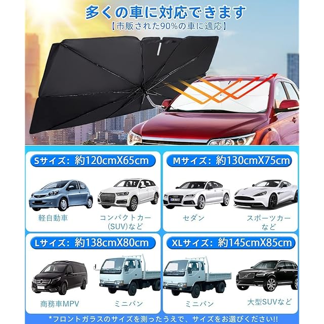 【様々な車に対応可能】4サイズ選択可能で99%の車のフロントガラスに対応できます。軽自動車、ビジネス車、MPV、SUVなどの中大型車もコンパクトカー、スポーツカーなどの小型車も使用できます(※ご購入前にぜひ愛車のフロントガラスサイズをご確認ください)。