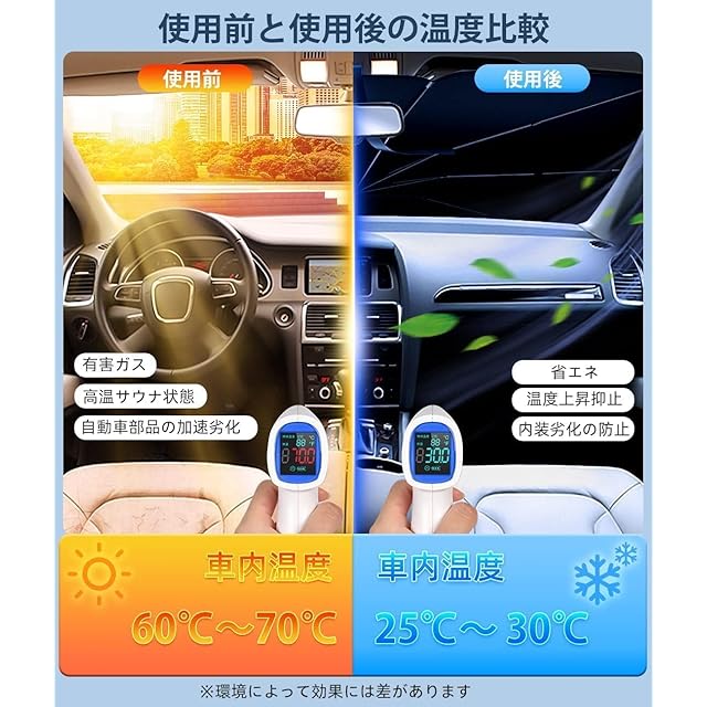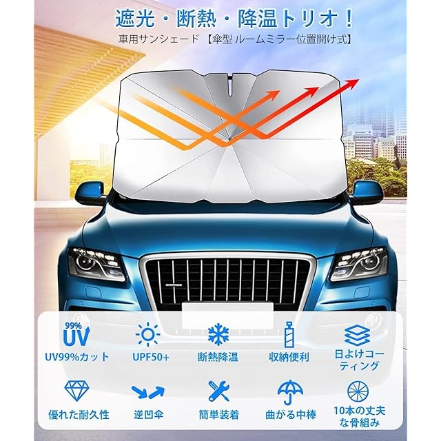 【耐久性が優れる&涼し 】この車 サンシェードは効率的な複合チタン銀接着剤を採用し、傘面:ナイロン、複合チタン銀接着剤、車内の温度を効果的に下げ、ダメージや経年劣化を防ぎます;傘骨:アルミニウム合金、鋼骨製;傘の柄:ABSプラスチック。サンシェードは熱を遮断して太陽光を反射し、99.5%の紫外線を効果的に遮断し、内装劣化防止。車内の温度を軽減し、エアコンへの負荷がへり、省燃費が向上します。駐車の度に気持ちをより涼しくしてくれます。
