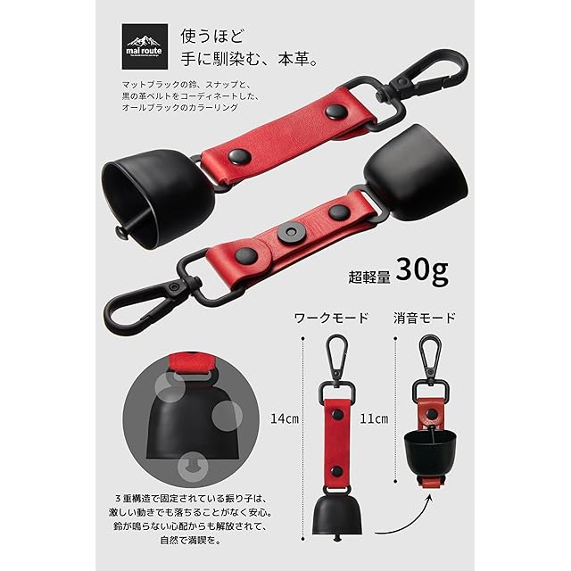 商品名:【日本正規品】マイルート(mai route) 心地いい音色の熊鈴 ワンタッチ消音機能付で快適な熊よけ鈴 小型 軽量 (01.ブラック) (06.レッド_セット)