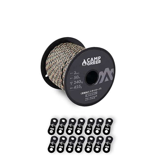 キャンプグリーブ 反射材入りパラコード 3mm/4mm/5mm ガイロープ 30m/50m巻 耐荷重240kg/350kg/420kg 自在金具12個付 継ぎ目なしノーカット テントロープ キャンプ (50, カモ/3mm)