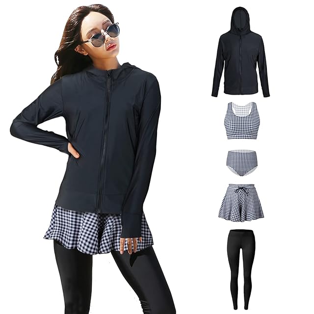 【豪華五点セット】長袖ラッシュガード(フード付き) フレアパンツ(ヒップもカバー!) スポーティビキニ ショーツ(ハイウエスト) レギンス