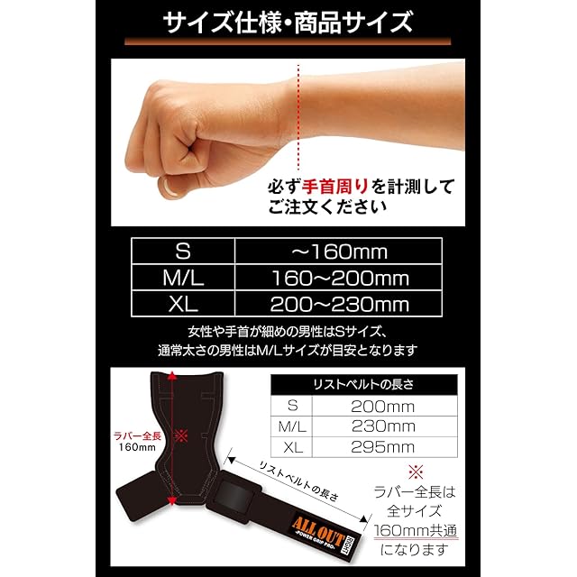 【現役ボディビルダー監修】 日本代表ボディビルダー浅野喜久男が監修。従来のパワーグリップの弱点を完全克服。浅野氏の監修の基、開発されたパワーグリップ。 【商品の特徴】 強力なグリップ力を発生するだけでなく、グリップ面の素材を強化し手首にあたるクッション性を高めました。使用中に手首が痛くならず、快適に利用することができます。耐久性が強く、摩擦・摩耗性に優れた特殊ノンスリップラバー生地を採用し、高いホールド力を実現しました。 【安心の返品返金付き】 品質に自信があります。安心してお使いください。 【類似品に注意してください!】 粗悪な類似品が出回っております。パワーグリップはALLOUTの正規品をお買い求めくださいませ。【商品のコンディションに関して】 ■税関チェックにて袋は一度開封がされております。 ■出荷工程の中で傷、汚れがつくことがございますが、商品自体は新品商品となっており使用上の問題はございません。 お手数ですが濡れたタオルで軽くふいていただけますと落ちますので、汚れ等が気になる場合はふき取ってご利用いただけますと幸いです。 返品・交換は受付しておりますので、商品お届け後1週間以内に 【 公式 】 ALL OUT トレーニングギア 専門店までお気軽にご連絡くださいませ。