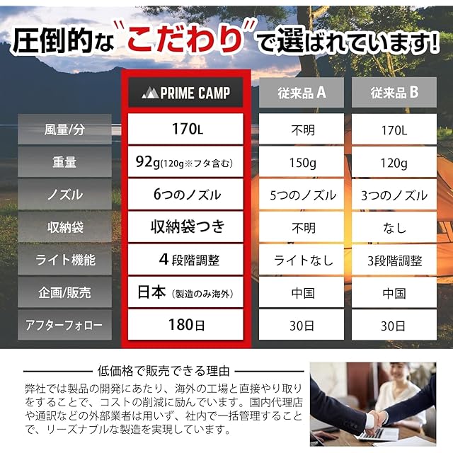 【6つのノズルで様々な用途をカバー】 弊社オリジナルのエアーベッド専用ノズルなど6つのノズルを用意。キャンプのインフレーターマット、エアークッションはもちろん、BBQの火起こしの送風、夏の浮き輪など様々な用途で活躍します。※製品によってはどのノズルもしっかりハマらない可能性がございます。その場合は手で押さえながらご使用ください。