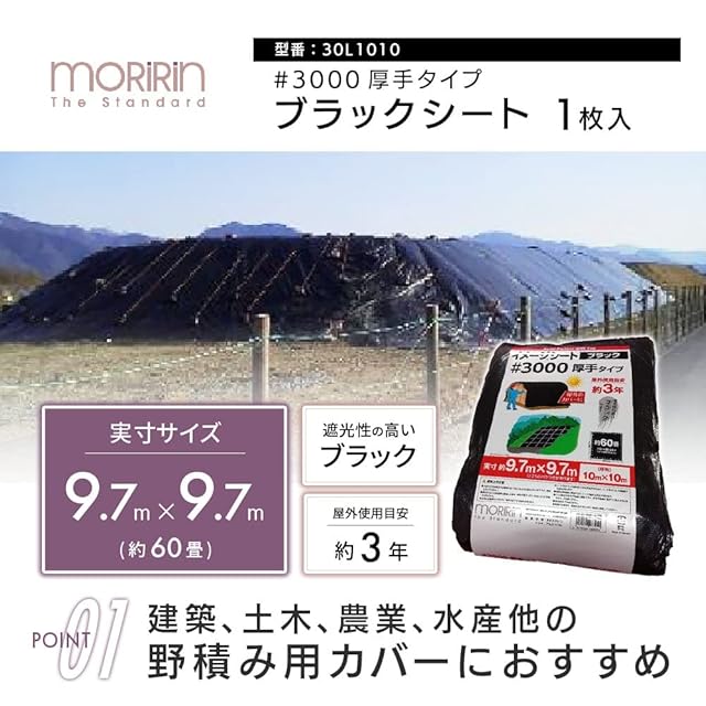 商品名:モリリン ブラックシート レジャーシート #3000 実寸約9.7m×9.7m 約60畳 厚手 屋外使用目安約3年 ハトメ数44 雨よけ 風よけ 野積み 30L1010