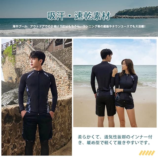 【素材構成&吸汗速乾】85%ポリエステル、15%スパンデックス。伸縮性と通気性に優れており丈夫で破れにくい素材を採用。軽量なのでとても動きやすく、最適の機能性、吸汗速乾通気のドライ繊維、激しい運動の後もさらっとした着心地!肌触りの良い素材を使用しているので、着心地は抜群。伸縮性に優れており、体形に合わせやすく、水中での動きも妨げないように体にフィットします。速乾性にも優れ、水に濡れてもすぐ乾きます、で運動も快適に行えます。前開き対応のラッシュガードは着脱も簡単です、着替えに便利。
