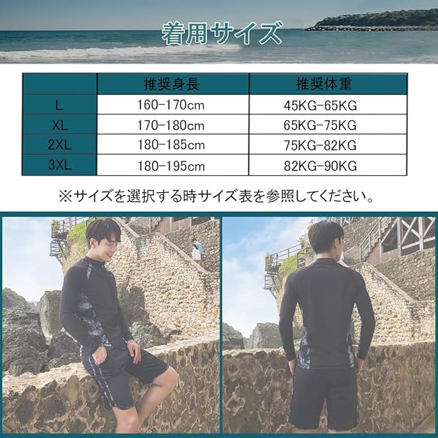 【セット内容&着用サイズ】長袖ラッシュガード、ハーフパンツ、レギンスの3点セット。必要なものがセットになっているので、届いてすぐに海に行くことができます。サーフパンツとレギンスセット、レギンス付き足首まであるので、虫刺されやクラゲ対策、擦り傷などの外傷対策にも。【着用サイズ】【L: 推奨身長160-170cm/推奨体重:45KG-65KG】【XL:推奨身長170-180cm/推奨体重:65KG-75KG】【2XL:推奨身長180-185cm/推奨体重:75KG-82KG】【3XL:推奨身長180-195cm/推奨体重:82KG-90KG】※サイズを選択する時サイズ表を参照してください。