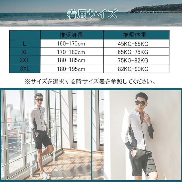 【セット内容&着用サイズ】長袖ラッシュガード、ハーフパンツ、レギンスの3点セット。必要なものがセットになっているので、届いてすぐに海に行くことができます。サーフパンツとレギンスセット、レギンス付き足首まであるので、虫刺されやクラゲ対策、擦り傷などの外傷対策にも。【着用サイズ】【L: 推奨身長160-170cm/推奨体重:45KG-65KG】【XL:推奨身長170-180cm/推奨体重:65KG-75KG】【2XL:推奨身長180-185cm/推奨体重:75KG-82KG】【3XL:推奨身長180-195cm/推奨体重:82KG-90KG】※サイズを選択する時サイズ表を参照してください。