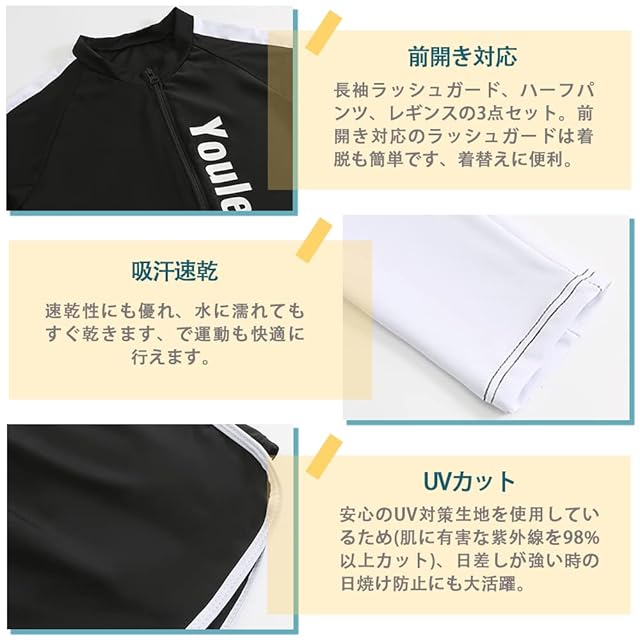 <b>【セット内容】</b><br/> 長袖ラッシュガード、ハーフパンツ、レギンスの3点セット。必要なものがセットになっているので、届いてすぐに海に行くことができます。サーフパンツとレギンスセット、レギンス付き足首まであるので、虫刺されやクラゲ対策、擦り傷などの外傷対策にも。<br/><br/> <b>【素材構成】</b><br/> 伸縮性と通気性に優れており丈夫で破れにくい素材を採用。軽量なのでとても動きやすく、最適の機能性、吸汗速乾通気のドライ繊維、激しい運動の後もさらっとした着心地!<br/><br/> <b>【吸汗速乾】</b><br/> 速乾性にも優れ、水に濡れてもすぐ乾きます、で運動も快適に行えます。前開き対応のラッシュガードは着脱も簡単です、着替えに便利。<br/><br/> <b>【UVカット】</b><br/> 安心のUV対策生地を使用しているため(肌に有害な紫外線を98%以上カット)、着るだけで、うっかり日焼け予防を実現。海やプール、アウトドアでの日焼け予防はもちろん、ランニング等の運動やタウンユースでも大活躍!<br/><br/> <b>【適用場合】</b><br/> スポーツやフィットネスに、サイクリング、スイミング、サーフィン、ダイビング、海水浴、プール、ビーチ、温泉と幅広いジャンルで使える便利なスポーツ・アイテムです。通勤、通学、ランニング、ヨガなど、スポーツウェアとしてもご利用いただけます。