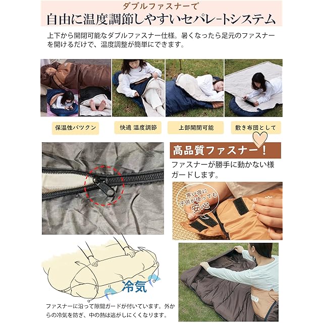 【最新裁縫技術】:まっすぐに縫われ、糸が出てなく、きれいで清潔。高級感が持つ寝袋。ダブルファスナーはサイドも足元も開閉でき、シーズンに応じて温度調節も楽々です。