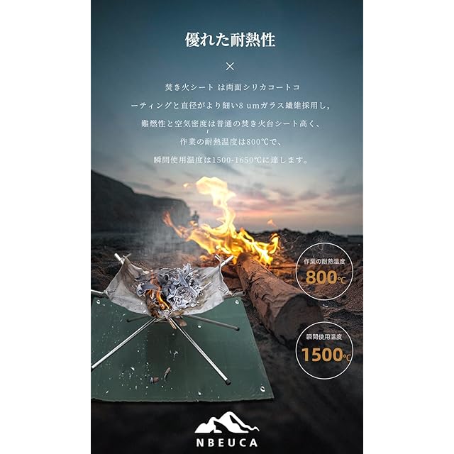 【耐火性がより強い】耐熱シート は直径がより細い8umガラス繊維採用し,難燃性と空気密度は普通の焚き火台シート高く、作業の耐熱温度は550℃で、瞬間使用温度は800-1300℃に達します。