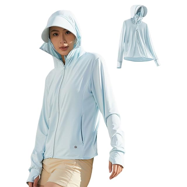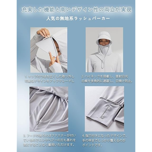 【充実した機能と高いデザイン性の両立が実現 】キャップのつばを広くした取り外し可能なデザインをアップグレードし、ハイネックを搭載し、日焼け止め面積を拡大し、直射日光の颜を多角的に遮蔽し、日焼け防止。フロントファスナーはフードの端まで伸ばしているので、ケアしづらい首もラッシュガード着用で肌を守ります。指穴付きになったデザインで、手の甲までしっかり覆えるのがポイントです。フードの後ろにはファスナーが付いているのでロングヘアーの方も蒸れを気にすることなく着用いただけます。