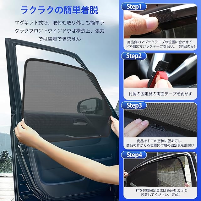 【遮光・通気・虫除け】太陽光をしっかりと遮断してくれます。素肌だけでなく、車の内装を日光による劣化から保護します。空気をよく通すメッシュ生地を採用しており、夏でも風を感じる快適な車内空間をつくり上げます。なお、全面保護で、蚊やハエの侵入を防ぎ、車中泊や仮眠時に大人も子供も害虫から守ってくれるので安心して休めます。