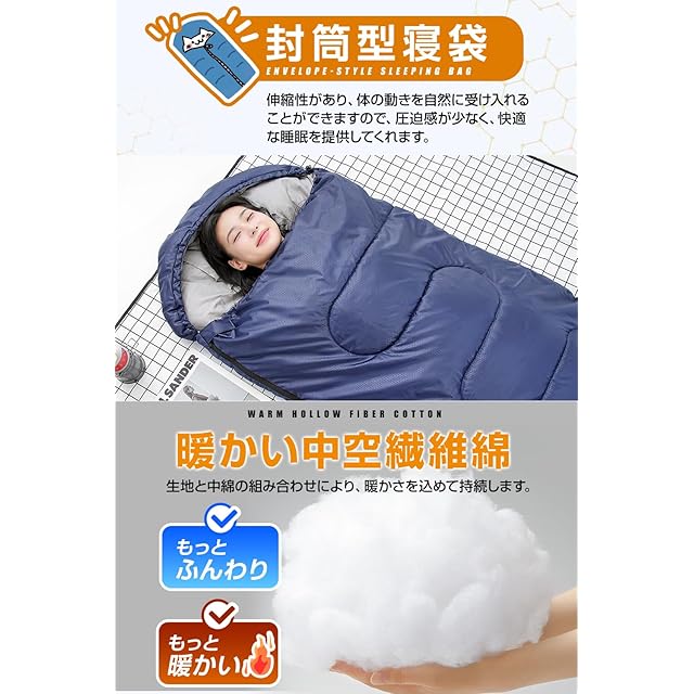【230T超撥水・優れる素材】表地:耐水性と耐引き裂き性備え、耐水性の高い230Tナイロン素材を使用しておりますため、防水性・撥水性に優れているのが特徴です。野外で多少の雨や霧に見舞われても、体を濡らすことなく過ごせます。内生地:肌触りが良いソフト生地(ポリエステル100%)、柔らかくて快適な素材で、いつでも寝袋に入ると暖かい感じがします。中綿:防寒性が優れいるポリエステル100%、 保温性能が高いです。裏地:上質な繊維素材で質感がよく、ふとんのように柔らかくて肌触りがよい、寝袋に入った瞬間でも暖かく感じられます。