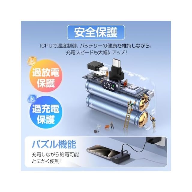 【ICPUスマート制御&PSE認証|安全性と信頼性を両立】ICPUスマート制御チップを搭載し、過充電・過放電・過電流・短絡などのトラブルを自動で防止する安全設計の モバイルバッテリー 。日本国内PSE認証も取得済で、旅行・出張・災害時にも安心して使用可能な power bank 。持ち運びやすい 軽量 小型 モバイルバッテリー でありながら、安全性も最高クラス。防災対策、アウトドア、日常のどのシーンでも信頼して使える次世代 携帯充電器 タイプc モデルです。