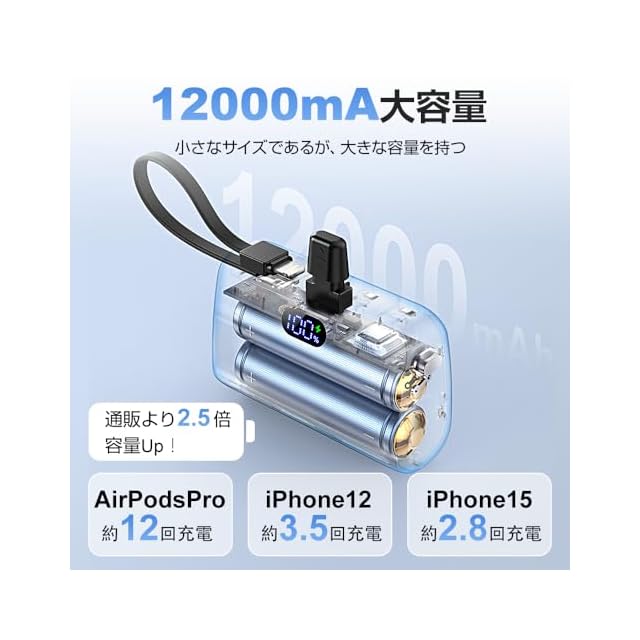 商品名:モバイルバッテリー 【2025軽量新基準・直挿し一体型・ 12000mAh大容量 】 タイプc モバイルバッテリー 軽量 小型 大容量 アンドロイド iphone 直差し 機内持ち込み可 type-c 携帯充電器2.1A急速充電 ケーブルレス LCD液晶残量表示 ケーブル内蔵 ストラップ付き 持ち運び便利 コンパクト ライトニング スタンド付き