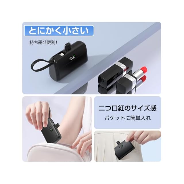 【直挿し一体型&12,000mAh大容量|手のひらサイズで驚きのパワー】本 モバイルバッテリー は2025年軽量新基準モデルとして、手のひらに収まるコンパクトサイズながら、12,000mAhの 大容量 を搭載した モバイルバッテリー です。iPhone 12なら約3.5回、AirPods Proなら約12回のフル充電が可能で、通勤・旅行・外出時でも電池切れの心配を一掃な タイプc 充電器 。さらにUSB-Cとライトニング端子を両方搭載し、スマホとイヤホンを2台同時に急速充電できるため、忙しい現代人にぴったりな 小型 軽量 モバイルバッテリー です。