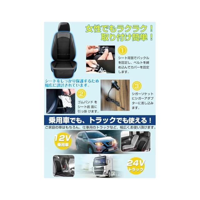 【取付簡単&安心】クールシートのゴムバンドをお車に掛けてシガーライターソケットに差し込むだけの簡単接続! 誰でも簡単に取り付け可能で、届いたその日からご使用いただけます。初期不良や使用中の自然故障等の場合は商品交換などのサービスを提供致いたします。万が一、商品について何か不明なところがあれば、是非遠慮なく気軽にお問い合わせください。