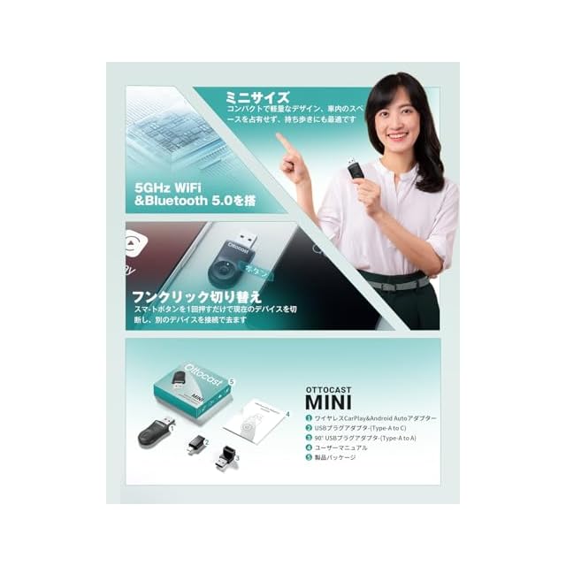 【Apple CarPlay / Android Autoをワイヤレス化】OTTOCAST MINI(オットキャスト ミニ)は、純正の有線Apple CarPlay・Android Auto(アンドロイドオート)対応車をワイヤレス化する最新アダプターです。carplay(カープレイ)android auto 切替OK、面倒なケーブルなしでBluetooth CarPlay体験を実現。USB Type-A&C対応で幅広い車両に対応。※OTTOCAST MINIはCarPlayおよびAndroid Autoの機能のみを提供しており、YouTubeなどの動画再生機能には対応しておりません。