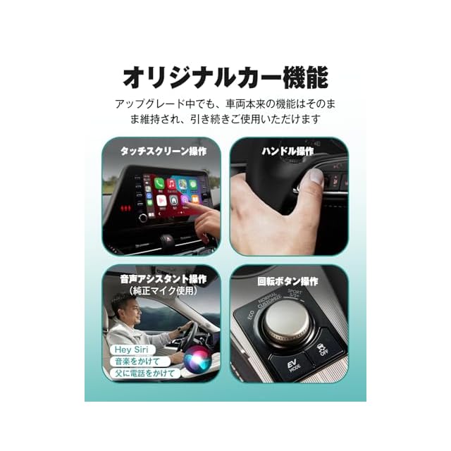 【ナビ・音楽・通話などフル機能対応】ナビゲーション、音楽再生、Siriアシスタント、電話、メッセージなどをサポートします。CarPlayやAndroid Autoアプリをフルに楽しみながら、車両のコントロールを維持できます。Googleマップで最新のナビゲーションを使用したり、Spotifyで音楽を再生したり、Bluetooth通話が可能です。さらに、音声コントロール(例:『駅にナビ!』や『音量を下げて!』)にも対応しています。毎回車に乗るたびにスマートフォンを接続する必要はありません。スマートフォンとのシームレスな統合で、安全かつ快適な運転操作が実現できます。