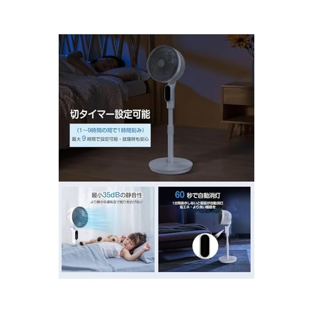 ❉彡【液晶表示無操作60S自動消灯・切タイマー機能・リモコン付き】サーキュレーター扇風機の液晶表示が無操作状態から60秒で自動的に消え、睡眠時に眩しくありませんので、ぐっすり眠れます。明るさ過敏の人にも最適です。設定時間経過後自動的に電源OFFになる切タイマー機能も搭載され、1時間ずつ、最大9時間のタイマーが設定できますので、寝ている時や消し忘れて外出しても安心です。前面のタッチパネルでも指で軽く触れるだけで操作可能ですが、離れた場所からも操作可能なリモコン付き、全ての操作が遠距離操作できるので便利です。